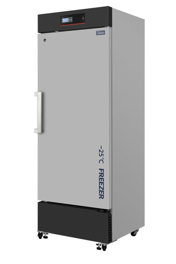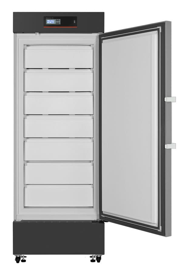 مجمد مختبري رأسي سعة 308 لتر:تخزين دقيق عند درجة حرارة -25 درجة مئوية مع تبريد سريع خلال 90 دقيقة (من 25 درجة مئوية إلى -25 درجة مئوية عند 220 فولت/60 هرتز) وتجانس مكاني ≤3.5 درجة مئوية، يعمل بغاز التبريد الهيدروكربوني الطبيعي R290 (معامل الاحترار العالمي = 3، لا يسبب استنزاف طبقة الأوزون). يتميز بثبات درجة حرارة مُتحكم به بواسطة حاسوب دقيق (±0.3 درجة مئوية) وتصميم رأسي موفر للطاقة. حاصل على شهادتي UL/CE لمراكز التأهيل المسبق للقاحات، وبنوك مواد العلاج الخلوي، وتخزين المنتجات الحيوية المتوافق مع معايير التصنيع الجيد.
